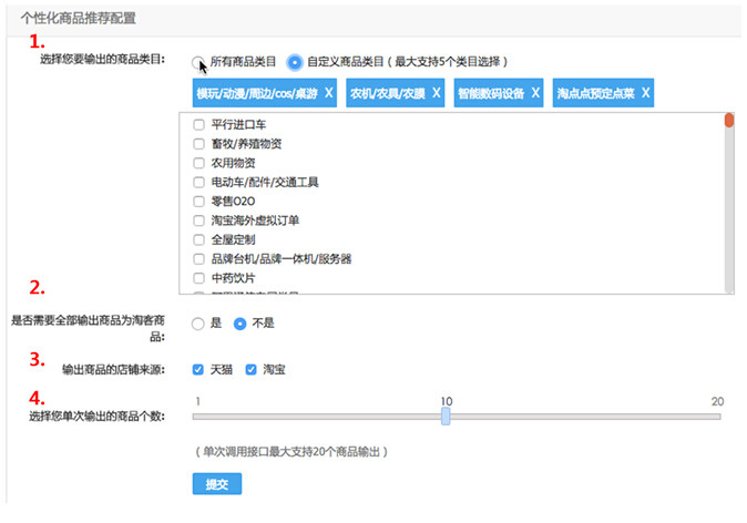 1.输出商品的类目:即推荐商品包含哪些类目,目前支持阿里一级类目选择,开发者可选择全部或者最大不超过5个类目。