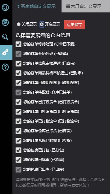 点击“开启展示”,选择需要在消费者端展示的状态,点击保存,即可开启。将从开启后生成的最新订单开始展示。