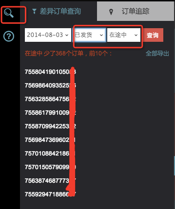 示例说明:当前查询为“已发货”与“在途中”之间的差异单,表示已发货状态下尚无物流信息的订单。选择下拉选项可以更换指定状态查询,支持导出功能(子账号导出功能需授权)