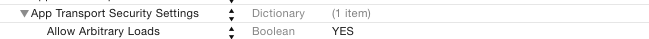 5) 修改 App Transport Security policy 在项目的plist文件增加以下配置。