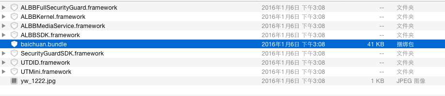 2) copy下载的SDK包目录下baichuan.bundle文件 到BundleResources里。